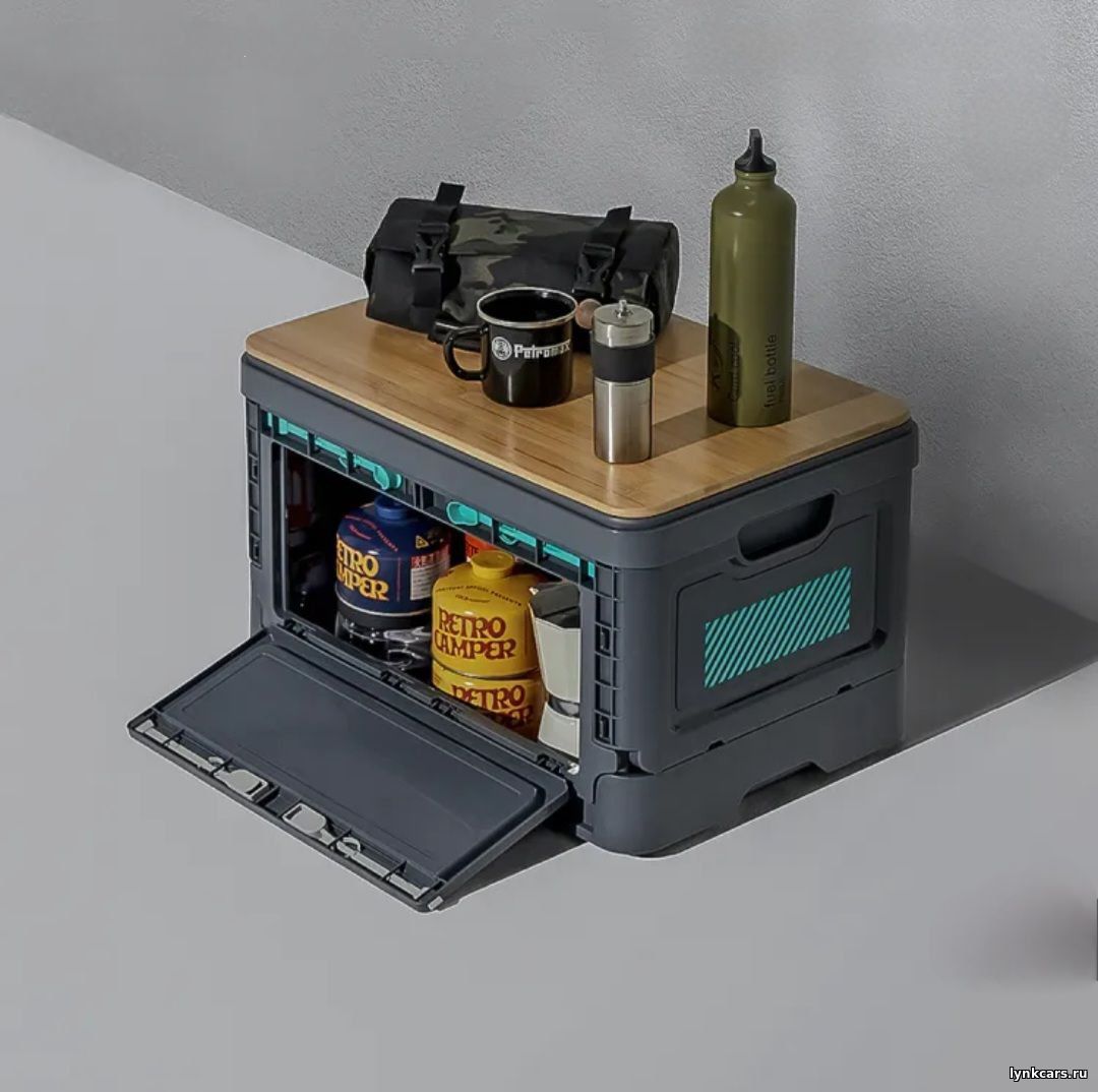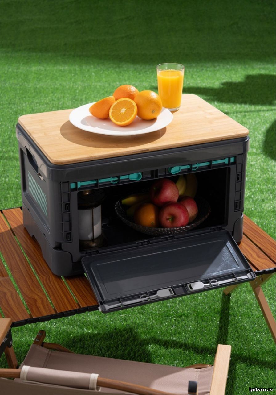 Благодаря дополнительной деревянной крышке из бамбука, складной ящик можно мгновенно превратить в уличный столик.